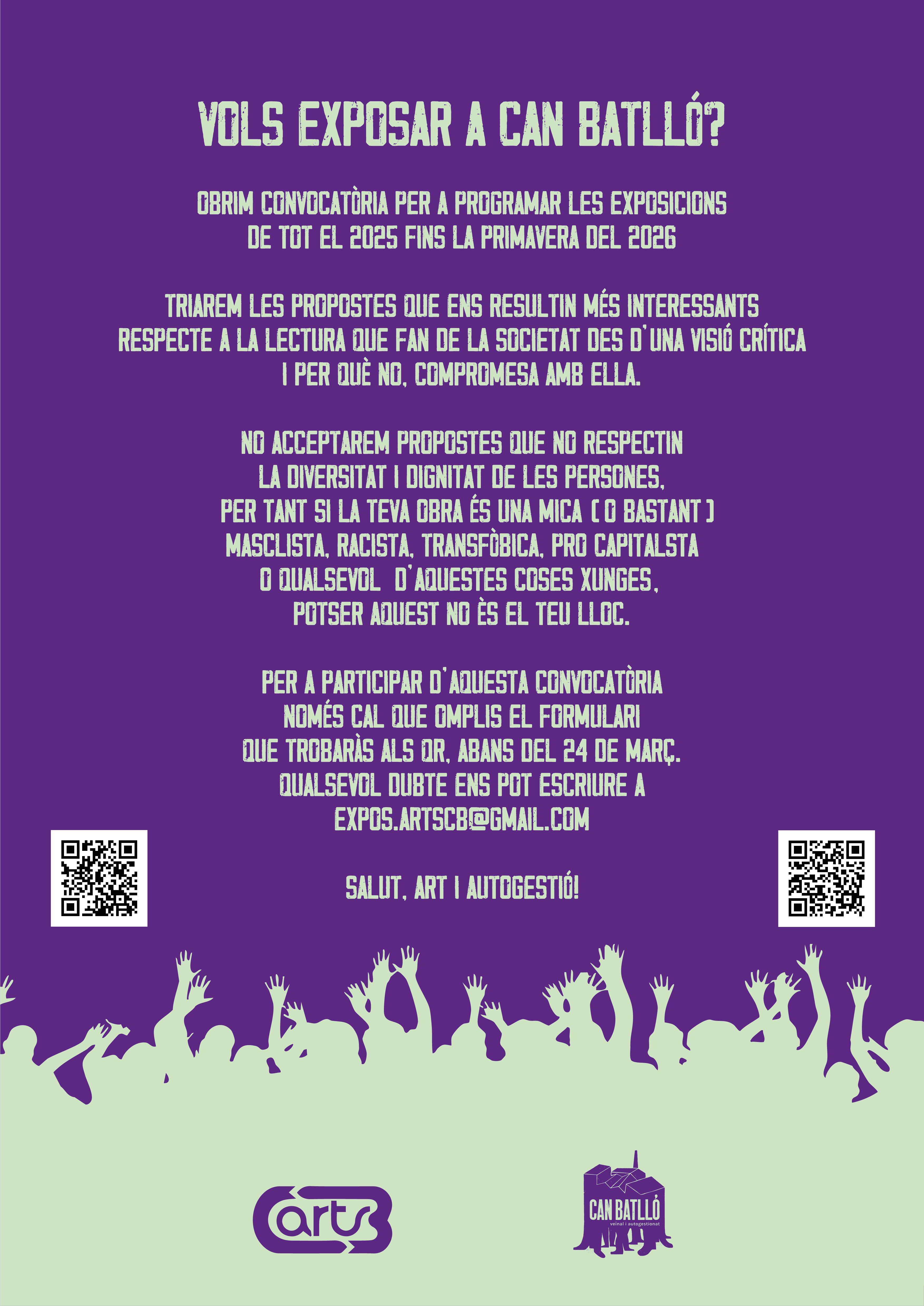 Amb molta ilusió avui obrim les CONVOCATÒRIES per exposar durant 2025-2026 a CAN BATLLÓ ???? Teniu 3 setmanes per enviar les vostres propostes escanejant el QR del cartell o bé accedint al formulari d’aquest link ????