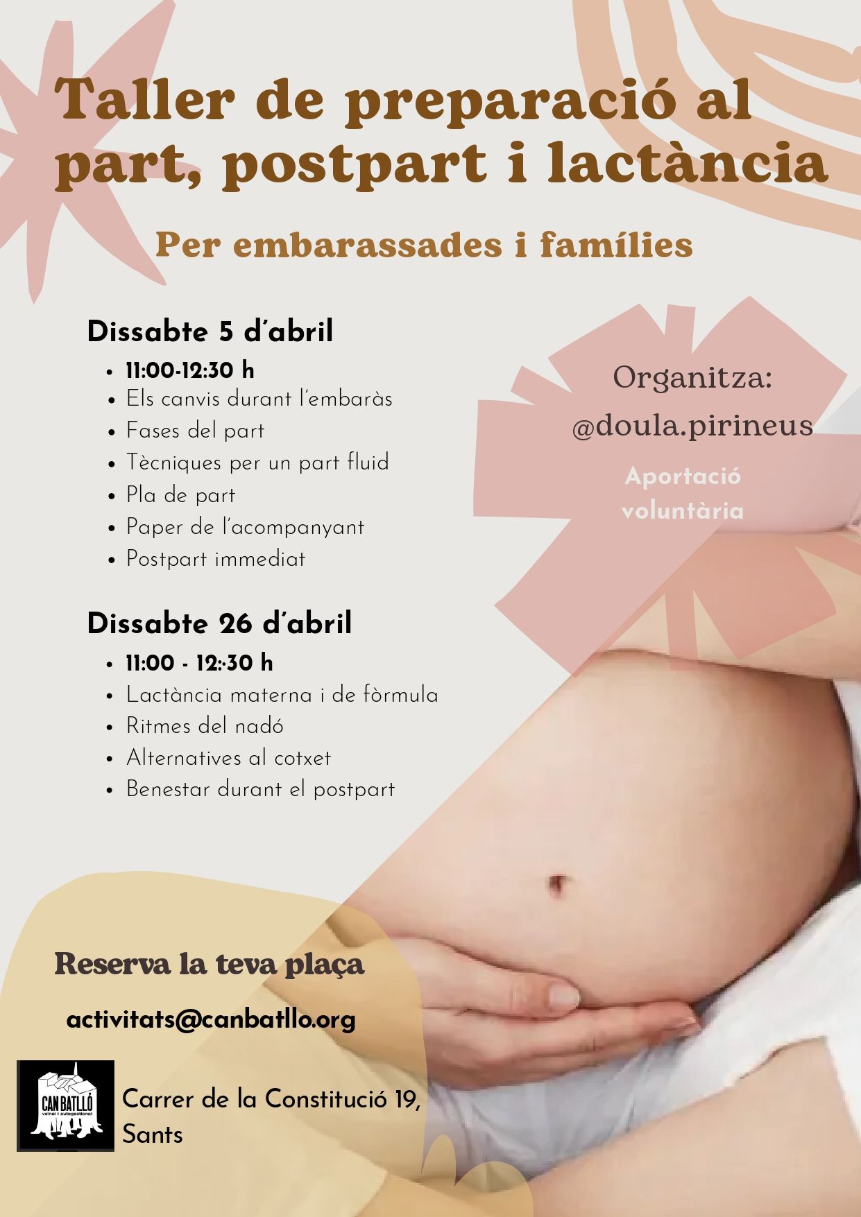 És un taller per embarassades i famílies. L’únic que haurien de portar és roba còmoda i estoreta i coixins per seure al terra durant l’estona del taller.