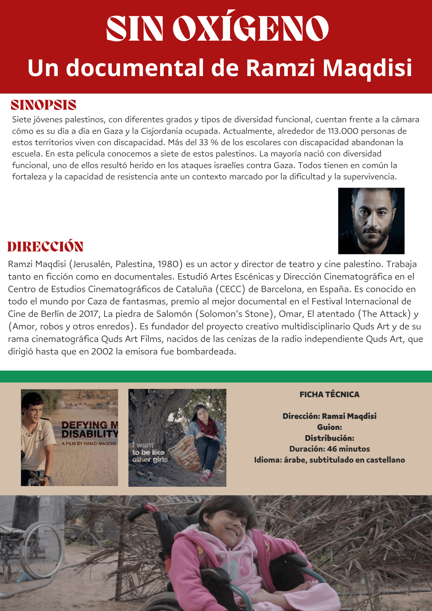 Set joves palestins amb diferents graus i tipus de diversitat funcional, ens expliquen el seu dia a dia a Gaza i Cisjordània. Tots tenen en comú la fortalesa i capacitat de resistència davant un context marcat per la dificultat i la supervivència.