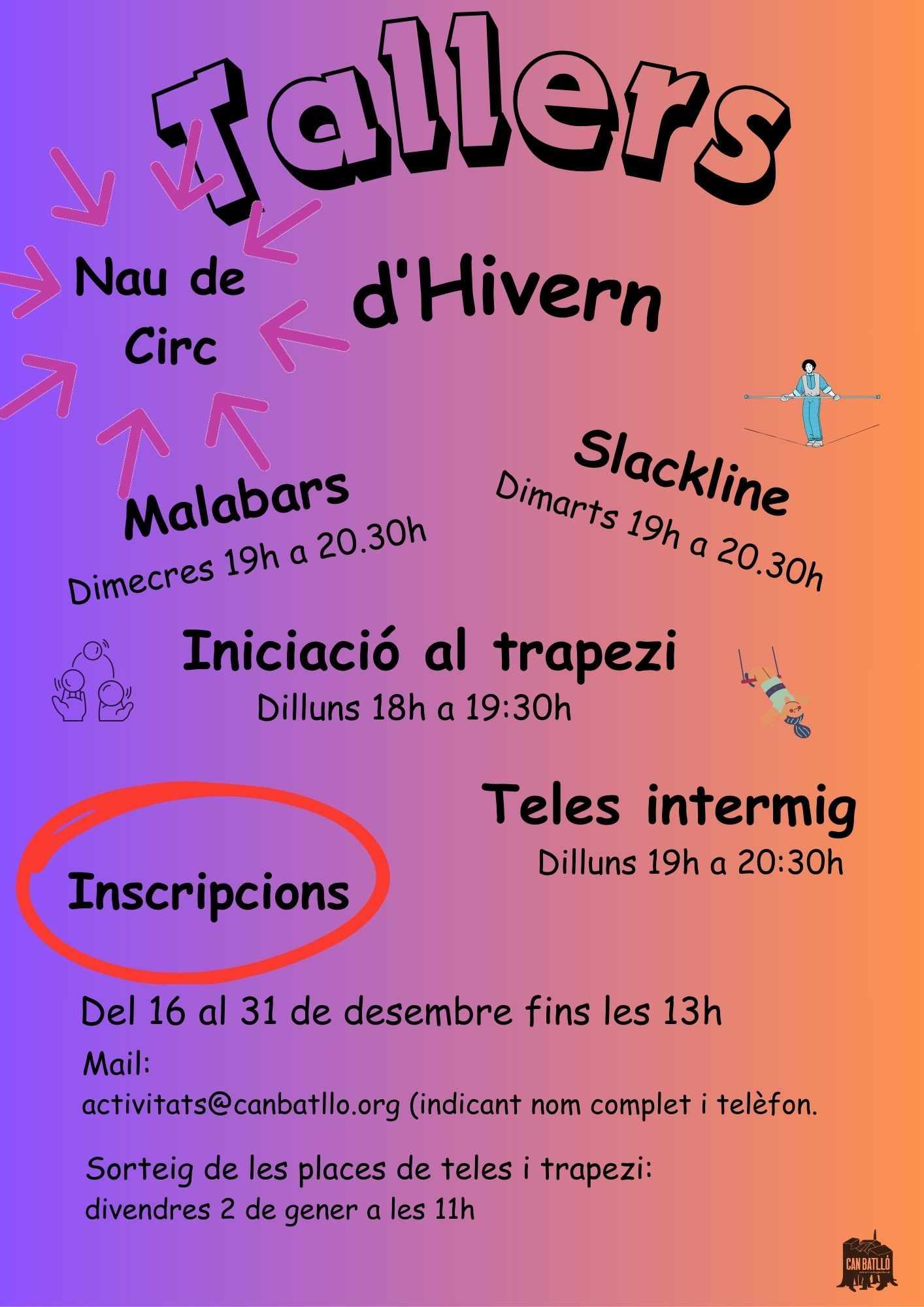 🔥 IMPORTANT: a causa de la gran demanda dels tallers d’aeris, (teles i trapezi) les places s’otorgaran mitjançant sorteig que es farà el dia 2 de gener entre totes les persones que s’han inscrit. Les persones que els hi toqui una plaça s’hauran de fer sòcies abans de començar el taller. 🔥
