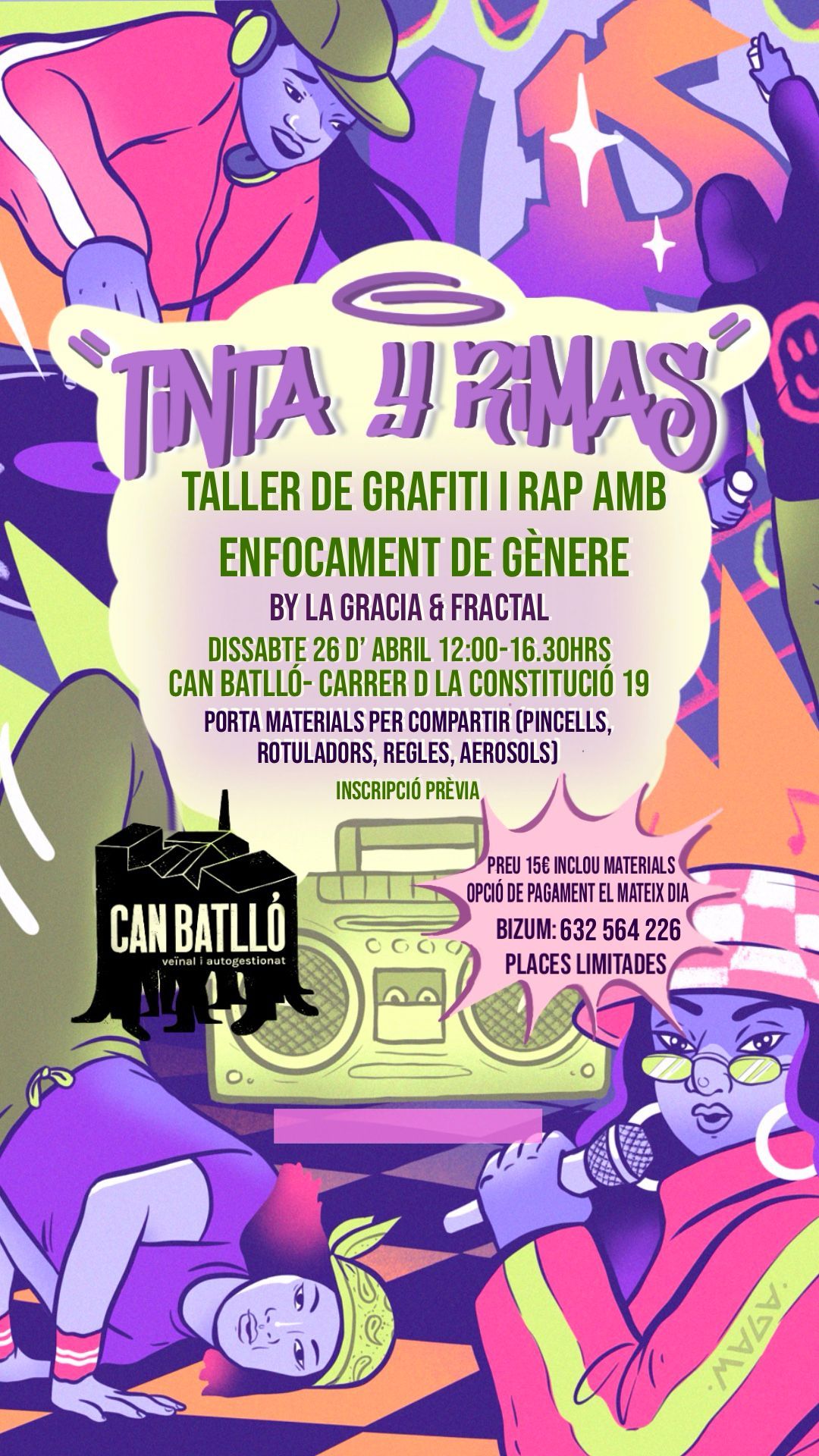 Hola, una salutació. Som Wendy i Camila de noms artístics Fractal i La Gràcia. Som dos artistes de Colòmbia amb residència a Barcelona. Camila a.k.a La Gràcia fa rap des del 2018, recentment és DJ i també té experiència com a Educadora Hip Hop. Wendy a.k.a Fractal, tatuadora i muralista des del 2019 i activa en diferents jornades de Muralisme a la ciutat amb experiència com a tallerista de Graffiti i cal·ligrafia.Volem que siguin partícips de “Tinta i Rimas” una proposta educativa i artística que hem construït per empoderar dones, joves, adultes i dissidències a través de l’expressió creativa. Amb una metodologia que combina teoria, pràctica i reflexió, el taller utilitza el grafit i el rap com a eines per explicar històries personals i col·lectius, explorant a més la dimensió de gènere en la cultura urbana.